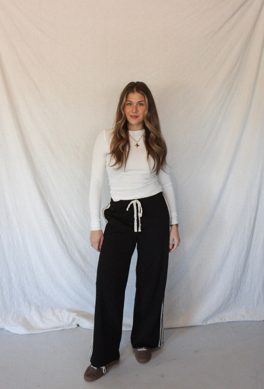 The Elsie Sweatpants bring a feminine touch to a sporty style. Featuring contrasting lace trim and drawstring waist, these lounge pants add texture to your typical outfit. Style with sneakers and a basic for an elevated sporty look.