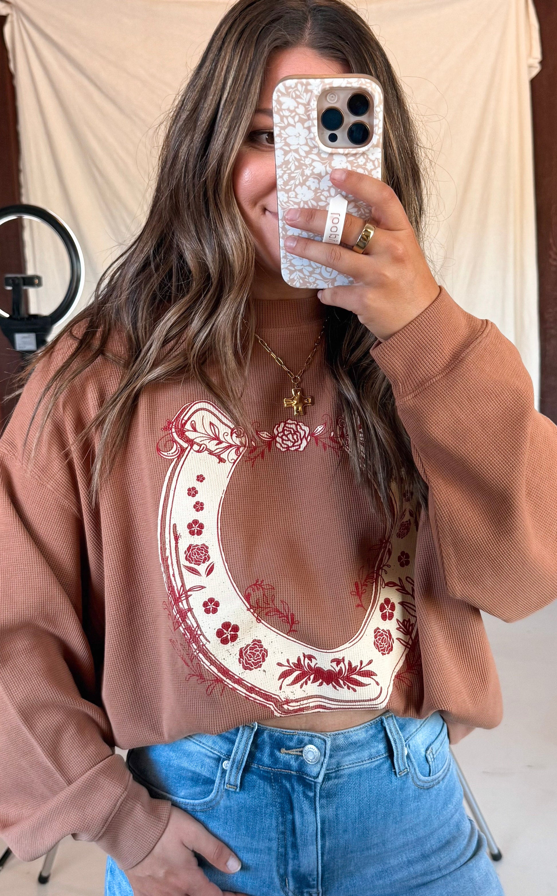 A waffle knit graphic featuring a horse shoe with floral accents. The oversized fit makes it comfortable and cute whether styled with your sweats or jeans.